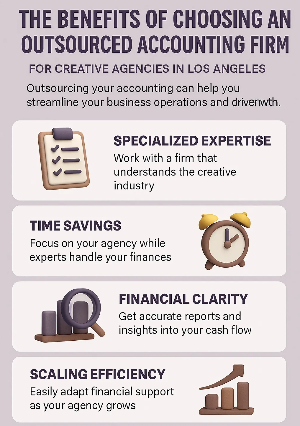For agencies in Los Angeles, the benefits extend beyond saving time or cutting costs. Outsourcing brings foresight — the ability to anticipate challenges, manage resources strategically, and free leadership to focus on creativity instead of accounting tasks. The result is a stronger foundation for sustainable growth and a sharper edge in a crowded marketplace.